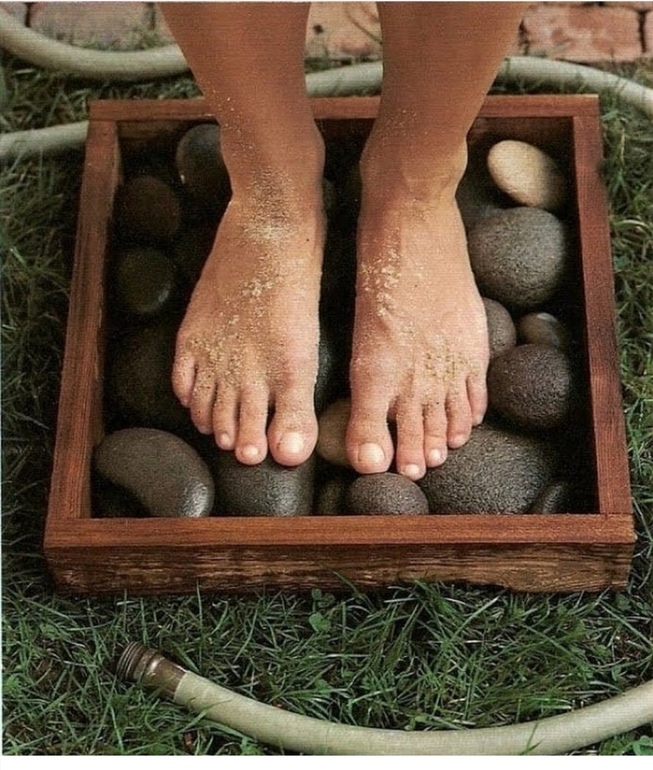 Корявенько звучит, но вопрос вот в чем: летом дети (и я тоже) часто ходят по двору босиком. Как у вас в таких случаях организован вход в дом? У нас на веранде стоит таз с водой, моют ноги, переходят на резиновый коврик перед дверью, заходят в дом на текстильный коврик, промокают ножки, идут дальше. Центральный вход без таза с водой, но там - дети знают, что босыми не заходим.