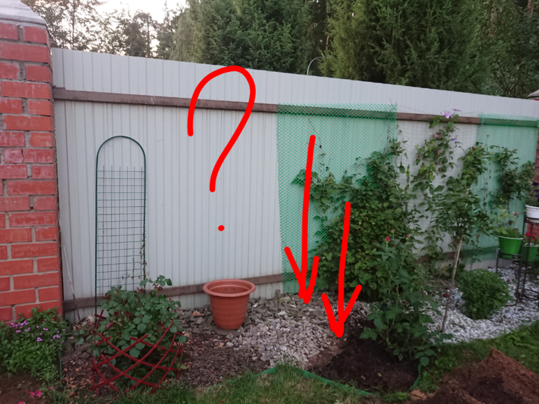 Где стрелки будут розы. Зелёные сетки заменю на невидимые. Клематис слева цветёт май-июнь, розы ещё не цветут.