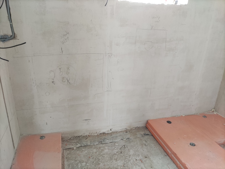 Чуть позже присоединился сантехник, он пободрее электрика, болтун, даёт хорошие советы. Мы купили почти всю сантехнику: ванну, 2 инсталяции, 2 унитаза, душевую систему, 2 трапа, 2 полотенцесушителя, смеситель в кухню, смеситель с душем в ванну, отдали 214т.р. за все. Остались тумбы и раковины в санузлы, там по плану Икеа, будут позже. Вот уже наскальные рисунки сантехника :)