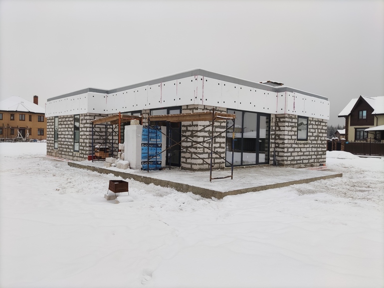 Посоветовались с фасадником, он нам сказал утеплять перекрытия над окнами и армопояс. Муж несколько дней утеплял по утрам перед работой, в финальный день помогла ему утеплить фасад (вспоминать страшно, какой был мороз, замёрзла адово).