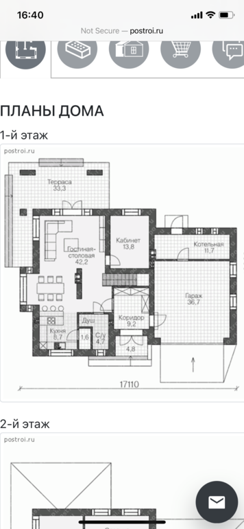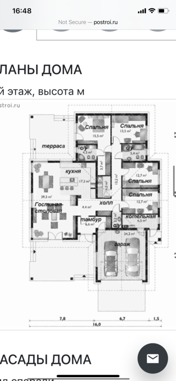 Мне посоветовали сайт postroi.ru, там очень много самых разных планировок! Вот пример на 1 этаж, все есть, и гараж, и спальни для всех, и мастер спальня, и огромная кухня-гостиная! 60 метров 😍