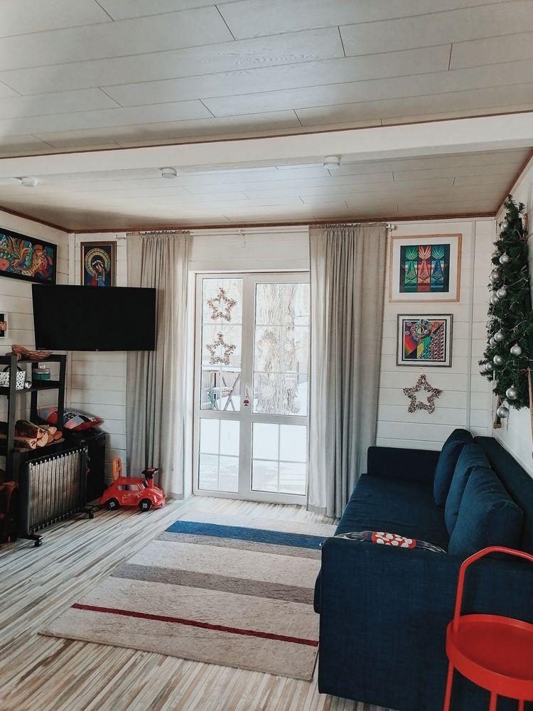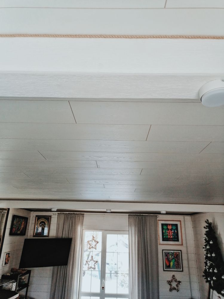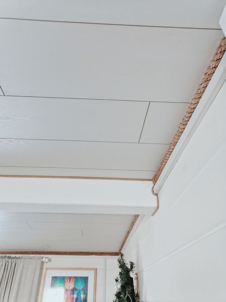 Вместо потолочного плинтуса - канат, два ряда толстого(на скрытых гвоздиках) и третий ряд будет тонкий, я ещё не закончила его клеить по всему периметру.