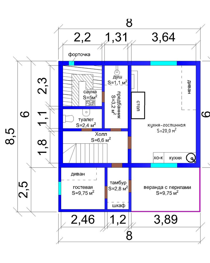 Nata, туалет на 2-м этаже муж не хочет(не любит шум канализации бесит это его), насчет метража там неправильно, по точным рассчетам 6,24 м я бы ее вообще не делала,тогда и тамбур нормальный получается, спасибо за комментарий