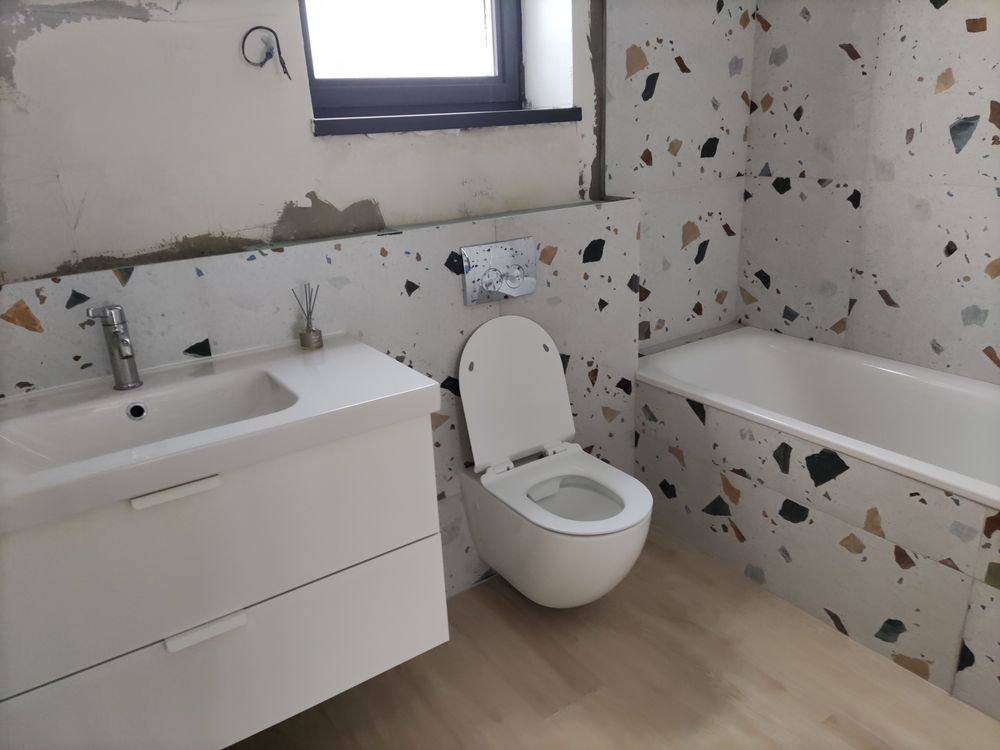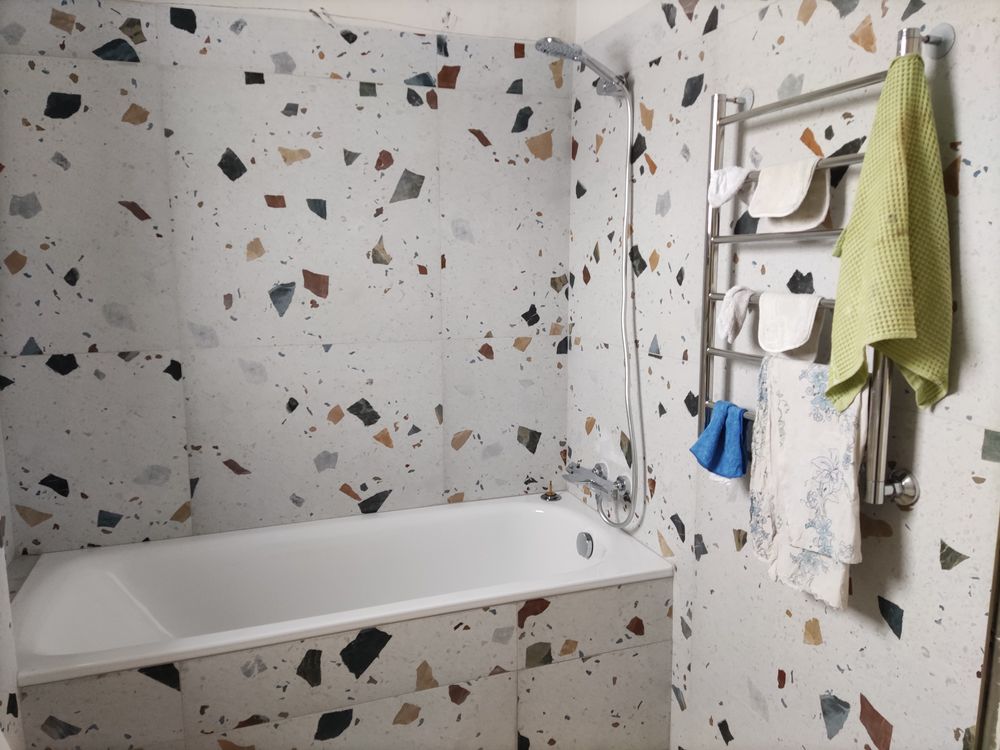 Кстати, про плитку, она у нас не очень удачная, как мне кажется... Она очень шершавая и дочь уже уделала пару носков просто бегая (до дыр прям). Когда зохожу в наш санузел, прям кайфую, там плитка гладкая, прям приятная, но будь она во всем доме было бы скользко.