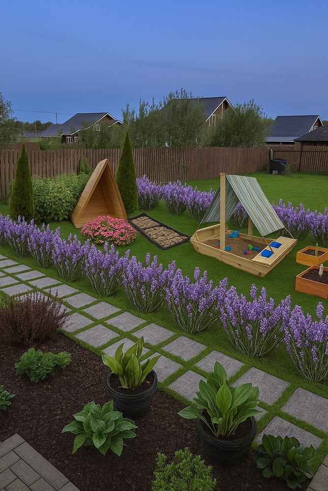 Ландшафтный дизайнПлан был прост: оградить уголок лавандой, благо с одной стороны она уже вовсю цветёт и благоухает, и впихнуть невпихуемое на квадрат земли. На повестке дня: шалаш, песочница, босоногая тропа, пара грядок и клумба — мой обязательный состав, с которым мы вроде как определились.