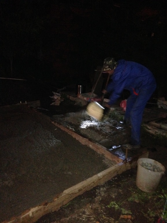 Пришлось опять мчаться искать щебень с песком)И тут начались дожди((( а как бетон заливать,нельзя(( полтора дня ушло на простой. Как только прекратился,мы сразу в бой) Приступили к заливки аж в 7 вечера... И закончили только в 2 ночи.