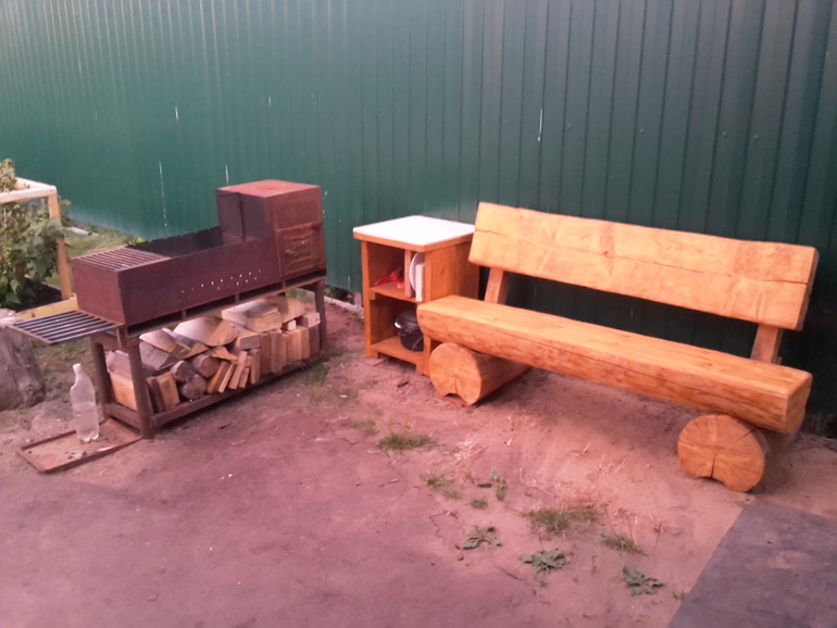 В этом году занимаемся благоустройством,Мангал,тумбочка и лавка сделана собственными руками мужа с моей помощью))