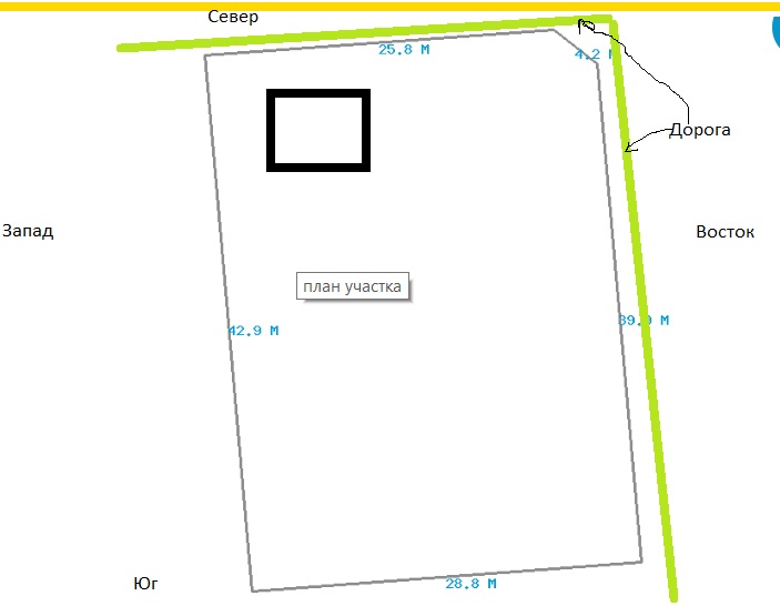 Ворота предполагаем расположить на срезе где написано 4.2. метра в верхнем правом углу такой скос участка, это получится на перекрестке, мне показалось, что удачное расположение, так как потом больше вероятности, что сможет подъехать большая фура и заехать на участок, если что.