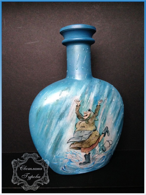 Малериалы: Бутылка, распечатка, все прорисовывалось акрилом, дождь и лужи нарисованы прозрачным контуром, лак-спрей.