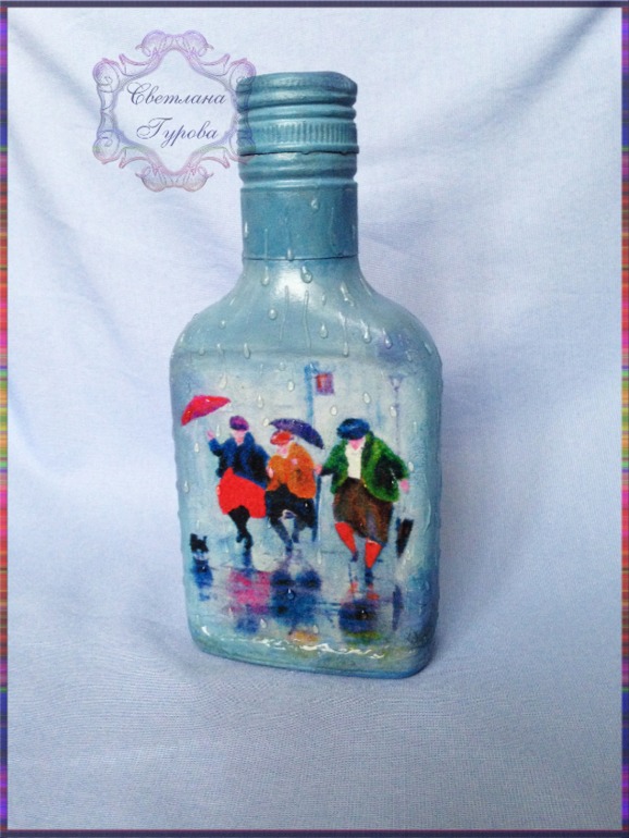 Материалы: Бутылочка, распечатки, подрисовка фона акриловыми красками, имитация дождя контуром Viva, лак.