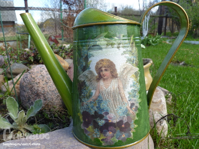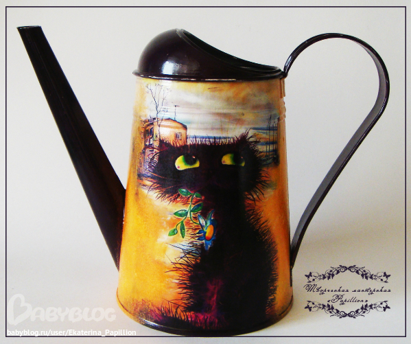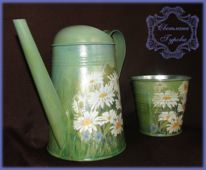 Материалы: лейка оцинокованная, салфетка, краски, лак, дорисовка.