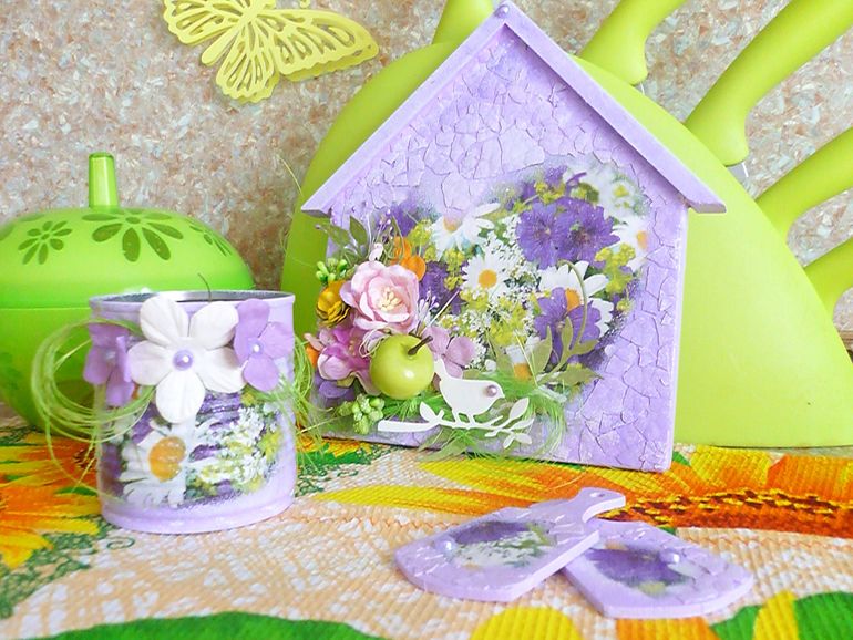старый бидончик превратила в новый,досочки деревянные(ими можно пользоваться),тарелочка декоративная.