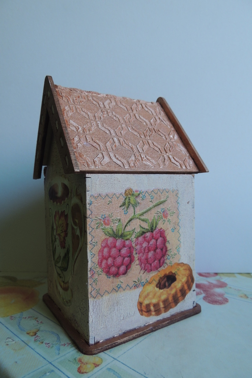 Он не очень яркий ,но какой-то уютный,крыша открывается-поэтому удобно будет складывать внутрь чайные пакетики.