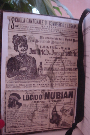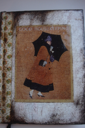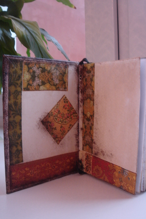 Не знаю, в чем дело. Может в схожести с прежним ежедневником? Я использовала вырезки из "Домашнего очага", как и в другом... Тут трещинки получились гораздо лучше, добавила декупаж. карту. Мне хотелось и внутри что-то красивое сделать - добавила фрагменты декупаж. салфеток и карту. Залезла в скрап, увидела, что там бумагу мнут, складочки подчеркивают, потом расправляют. Попыталась повторить. Еще хотела, чтобы бумага (первые листы и офсет) выглядели пожелтевшими от времени. Протерла сухой корицей - не получилось, кофе - нет. Развела кофе, тряпочкой протерла. Я не очень довольна результатом. Пришлось потом долго под прессом держать, т.к. листы заволнились... Нужны были, согласно "творческому замыслу" темные края страничек. На просторах инета нашла, что подоблое делают Дистрессом. Зашла в магазин рукодельный, спросила, а они думают, что дистресс - это состояние противоположное стрессу. :-))) А по штампинг - они меня спрашивали, как ими пользоваться. Прошлось выдумывать новые технологии. Сначала пробовала на старом ежедневнике. Я и жгла края и чем только не терла. В результате - мой любимый битум. И кое что еще!