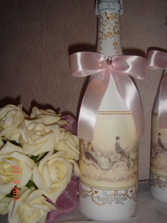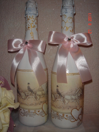 получился целый набор:шампанское( мотив салфетка,акриловая краска белая,контуры,лак),бокалы(белый акрил.балончик,стразы сваровски,контур и ленточка), ну и розочки из полимерной глины.
