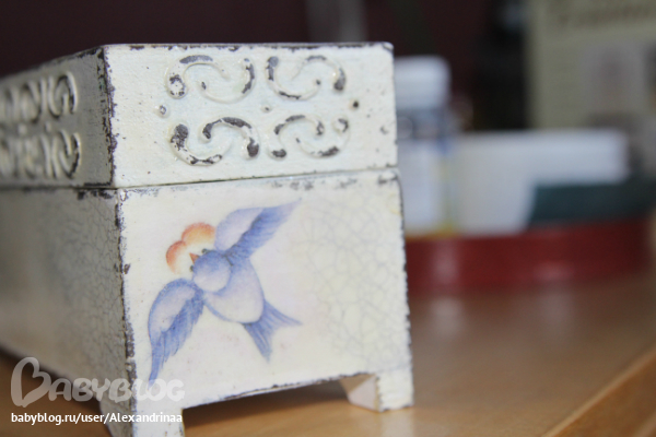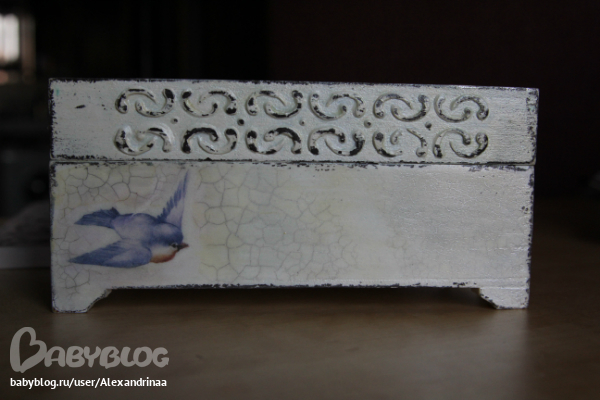 скажу честно, накосячила тут. край рисовой бумаги был виден. как я не перекрывала краской, лаком, шкурила до безобразия, ничего не вышло. хотела сделать более лаконичной шкатулку, но нне вышло. единственный вариант был кракелюр по краю. вот что получилось. (кстати, теперь край рис.бумаги обрываю и все супер!)