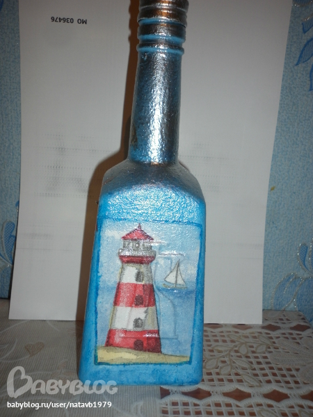 Вот такая бутылочка получилась,на морскую тему.Моя вторая работа