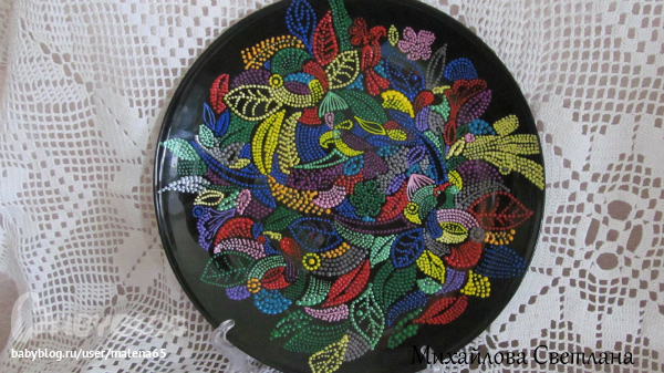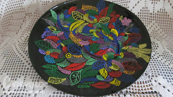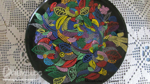 Посуда, тарелкиработа выполнена в технике point-to-point. Почему попугаи?..да вот они там спрятались в серпантине красок)))