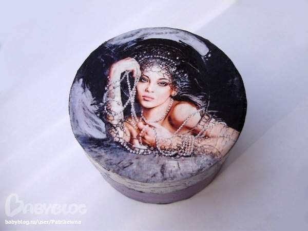 Декупаж с капелькой кракелюра по картонной коробочке :) - распечатала картинку на фотобумаге и обработала трансферным медиумом. Бусы сделала объёмными при помощи серебристого контура