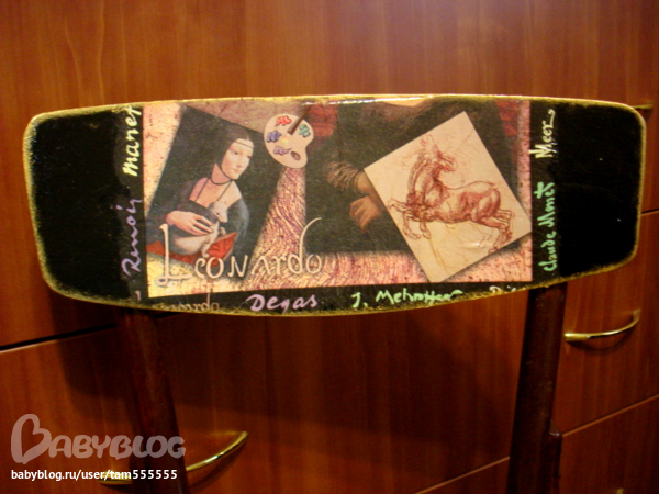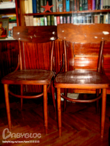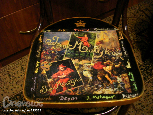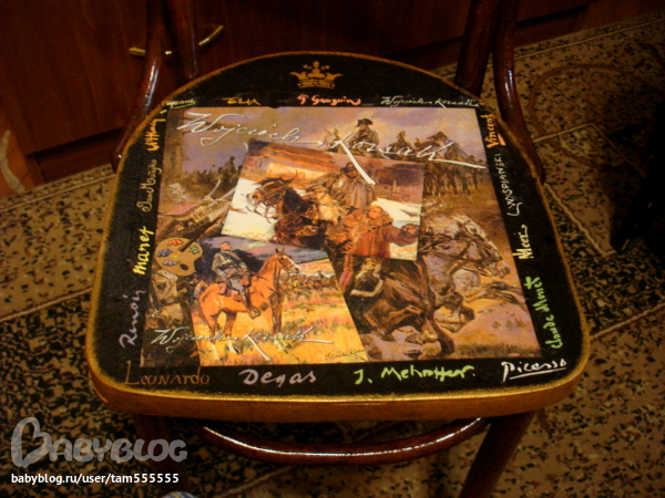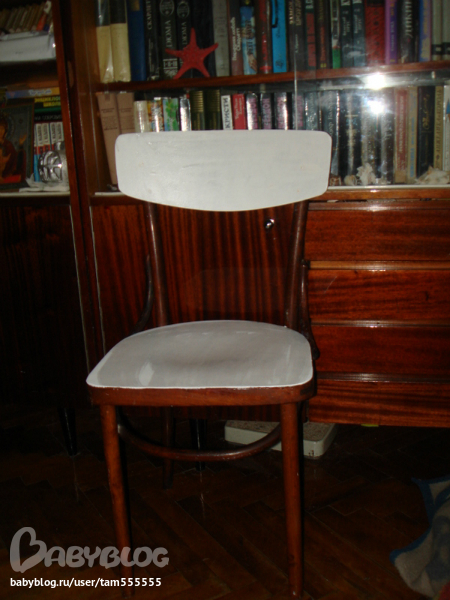 1. Стулья зачистила, подкрасила тёмным цветом, а седушки и спинки, белой акриловой краской.