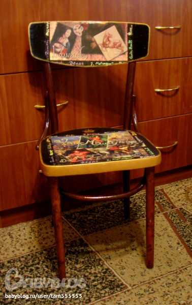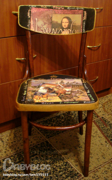 Друзья попросили обновить 2 старых стула на дачу.Мебель на даче тёмная, поэтому стулья должны быть тёмными. Долго не находила салфетку. И вот получилось то, что видите.