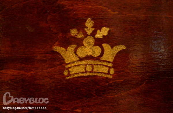 4.При помощи трафарета, золотой акриловой краской, нанесла корону на седушку и на спинку стула.