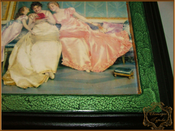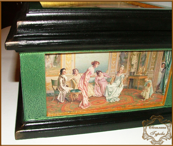 Работа простая, делала лаковые распечатки, заливала зеленую красочку Pebeo Fantasy ( про нее очень много информации в интернете) и красила черным акрилом бортики. Все покрывала лаком. Все мои работы можно посмотреть на сайте sdekora.ru ( Я его чуточку забросила, надеюсь, временно, но вся информация там есть... и МК)