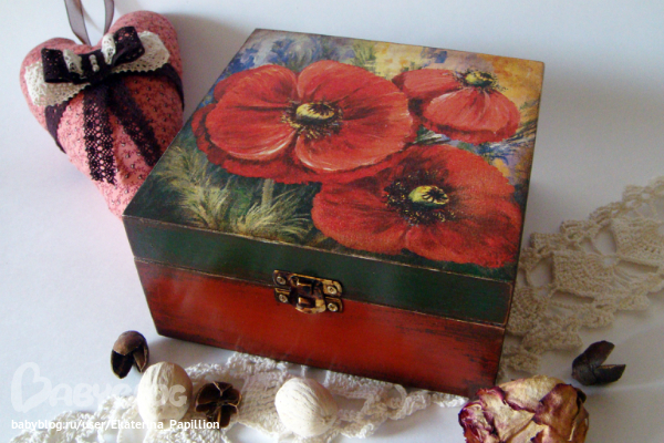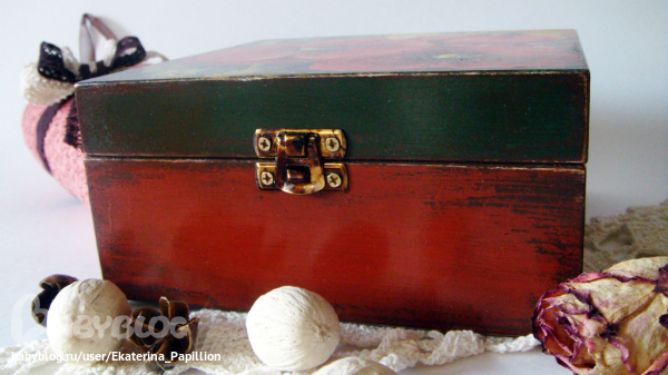 Шкатулки, коробкиШкатулка фанерная, акриловый грунт, салфетка, акриловые краски Олки зеленая теплая, английская красная, акриловая краска Плэйд темно-коричневая, потертости свечкой, Медиум антик Плейд 819 яблочно-коричневый, лак Тиккурилла Кива п/мат.Фурнитура состаена битумом Таир.