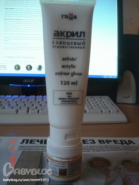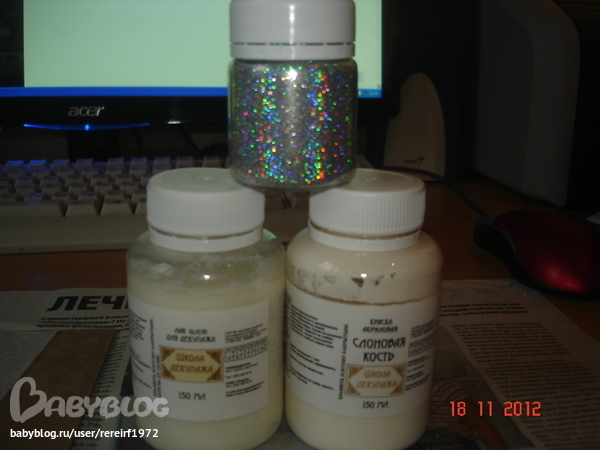есть еще :лак клей, акриловая краска слоновая кость и блестки.