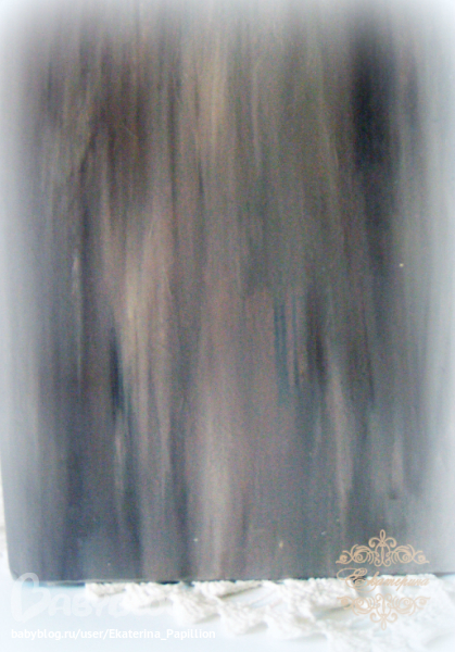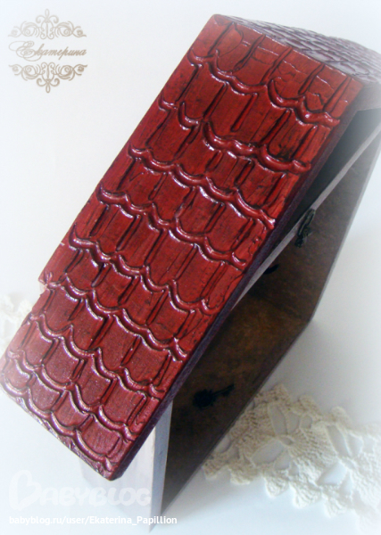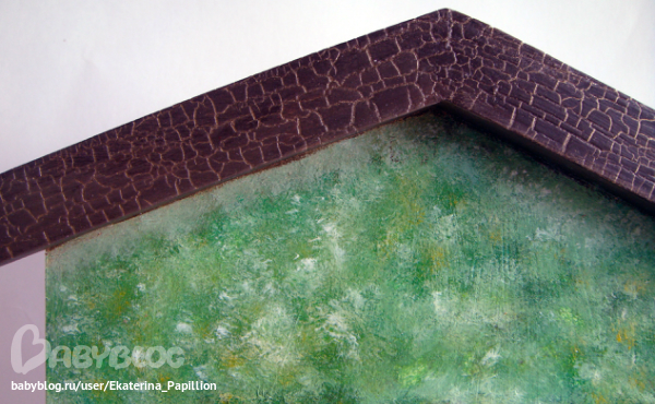 Основа МДФ, грунт, акрил, салфетка. Объем некоторым горшкам сделать с помощью Паперклея, на цветочках молерующий гель Таир, смешанный с акриловыми красками. На крыше кракелюр Креал Кракле, затерт золотым пегментом