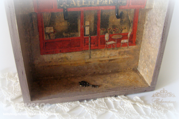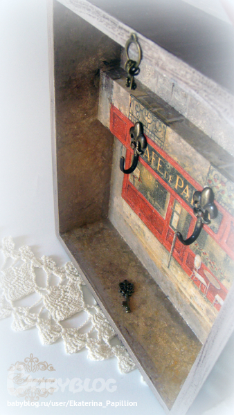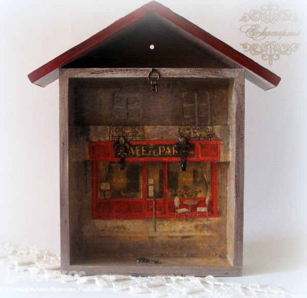 1. Париж. Основа из МДФ, салфетка, акриловые краски, лак Кива, крючки и подвески, на крыше текстурная паста Сонет