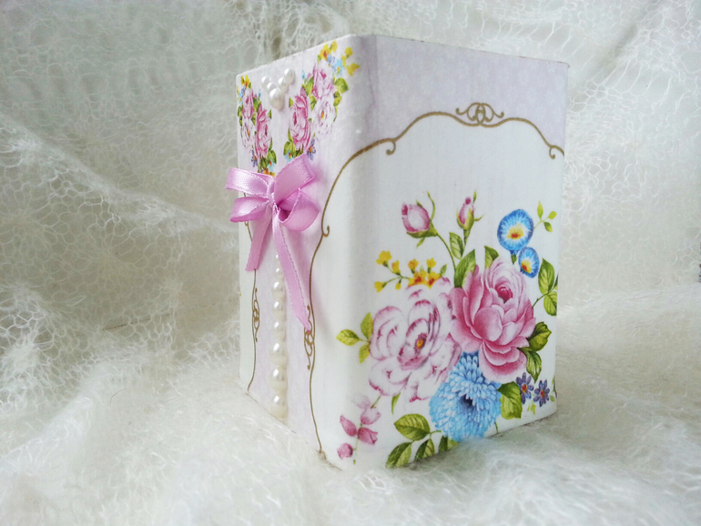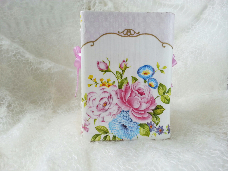 спасибо большое!Т.к. я не специалист в декупаже, изучаю этот процесс, то техника проста очень!Салфетка, клей ПВА, белая краска.Сначала я ошкурила заготовку, затем загрунтовала белой краской, после просушки еще раз чуть ошкурила. Подготовила салфетку, нанесла клей ПВА на заготовку и методом файла приклеила к заготовку. Где было необходимо, клеем еще подмазала. После высыхания покрыла лаком, затем украсила.На самом деле методом файла чуть трудно было, т.к. тут углы закругленные и надо было ооочень аккуратно и ровно приклеивать!есть погрешности, но для первых разов я очень довольна!!!!!!!!