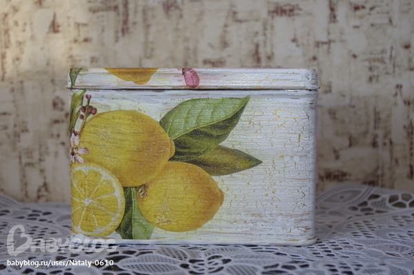 Ход работы: Загрунтовала коробку для заварки, покрасила золотым акрилом, кракелюрный лак, белая краска( сколько раз я это делала со счета сбилась, не получалось нанести краску), наклеила мотив, нанесла тени, почти совсем растушевала так как не очень понравилось