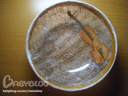 тарелочку обезжирила, приклеила фрагментиз салфетки, потом фон ноты - рисовая бумага, края прочпокала краской, все прошла лаком ... вживую оч нравится, а на фото мне нет (