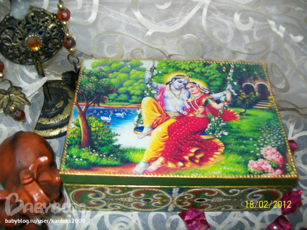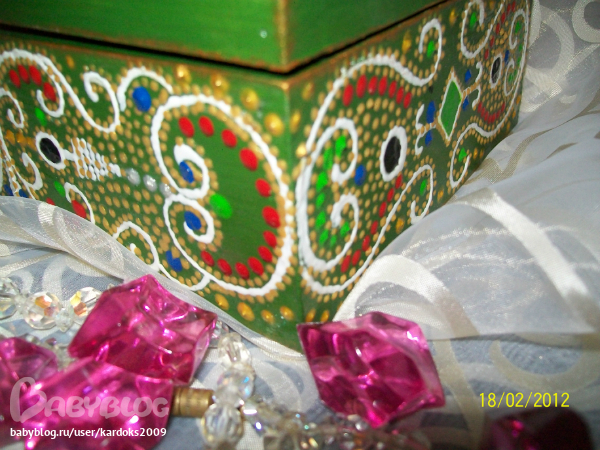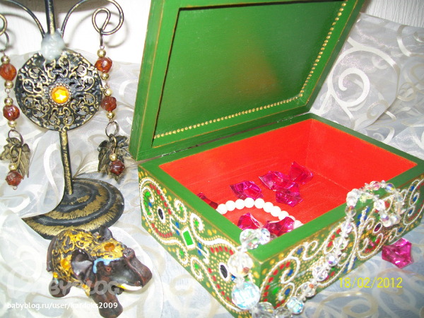 Ход работы: Шкурение , грунтовка крышки белым акрилом,всей шкатулки зеленым,внутри красным.