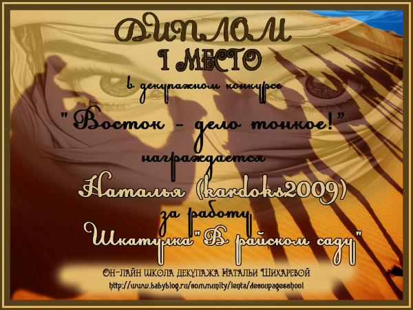 Поздравляю всех девочек!Дипломы отличные!Впрочем и как работы!На сей раз повезло всем участникам конкурса,т.к. все получили !!!