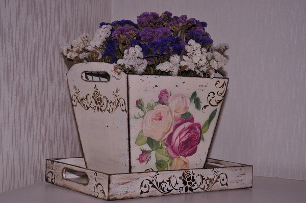 по-моему, для шебби немного ярковато. Обычно, Наташа советует домешать в лак каплю белой краски и пройтись сверху, чтобы рисунок не такой яркий был.