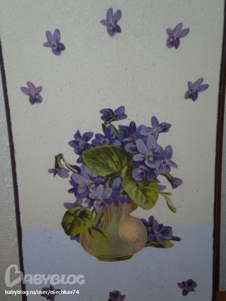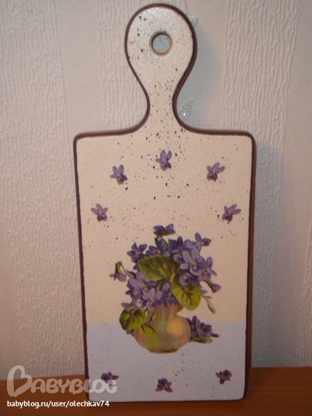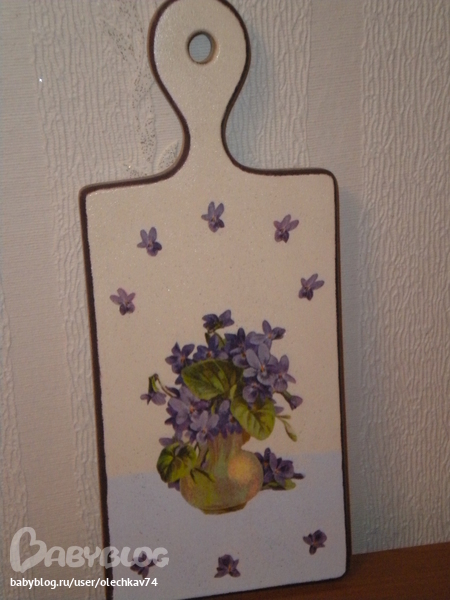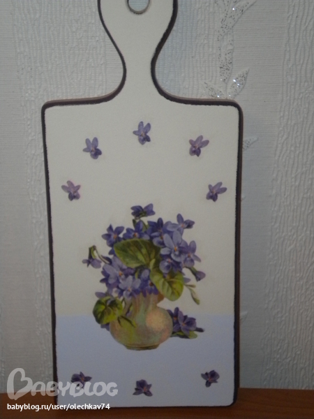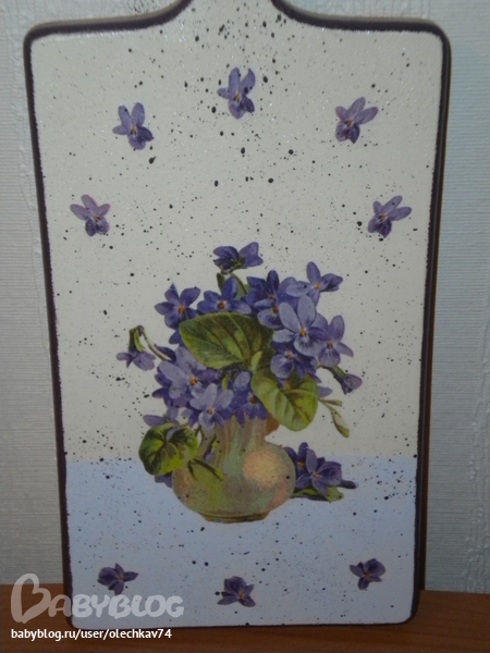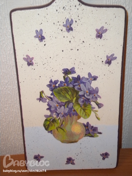 Зашкурила доску, загрунтовала, покрыла акриловой краской слоновая кость 3 раза, последний с помощью губки, приклеила основной рисунок с помощью файла, не лакировала - сомневаюсь пока.