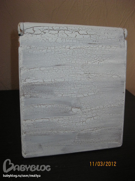 Ход работы:Загрунтовала поверхность, покрыла коричневой краской. Натерла свечкой и нанесла немного кракелюрного лака. Покрыла все белой краской, прошлась шкуркой и приклеила мотив из салфетки