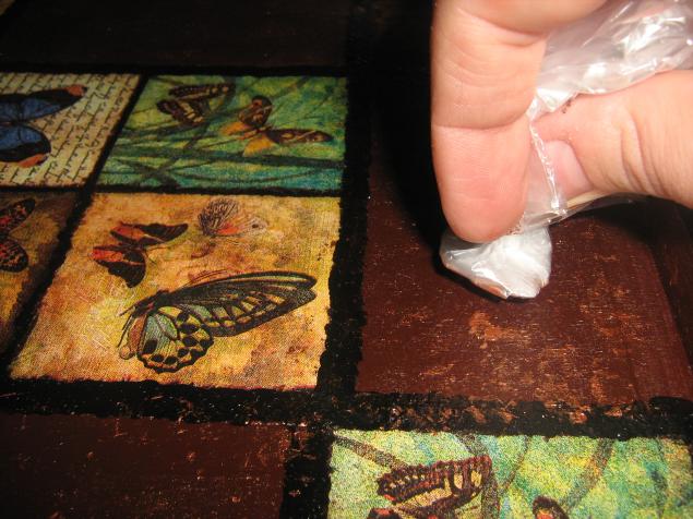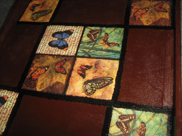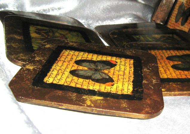 Так я прошлась по всему подносу и подставкам . После того, как краска высохла можно приступать к лакировке и шлифовке . Этот процесс может стать бесконечным