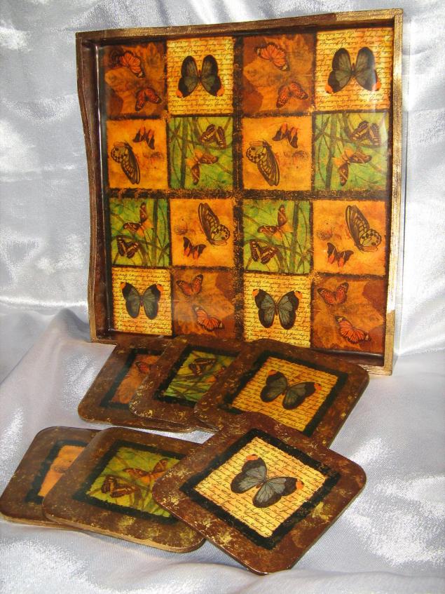 Итак , в наличии есть двухсторонний поднос и подставки под горячее. Нам понадобятся салфетки , краска акриловая (умбра жженая , охра , золотая , бронза , черная) Клей для декупажа (у меня канцелярский ПВА ) и лак глянцевый.