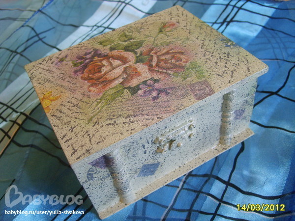 Посоветуйте! (обсуждаем черновые работы)Еще раз показываю свою шкатулку. С тенями разобрались, я их еще углубила серым цветом, по совету Наташи. Потом решила продлить надписи от фрагментов и сделать набрызги (хотелось как-то состарить немного). Теперь мне кажется, что с набрызгами или надписями я переборщила. Не слишко ли пестро получилось? И как исправлять, ведь я в промежутках лаком не покрывала?!