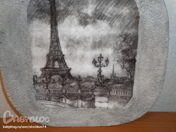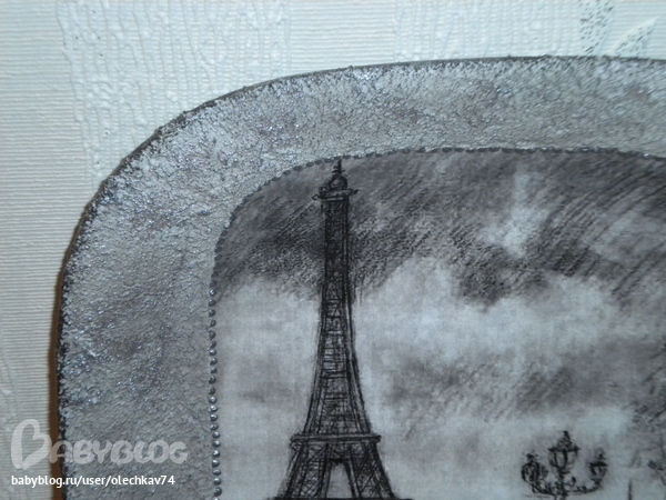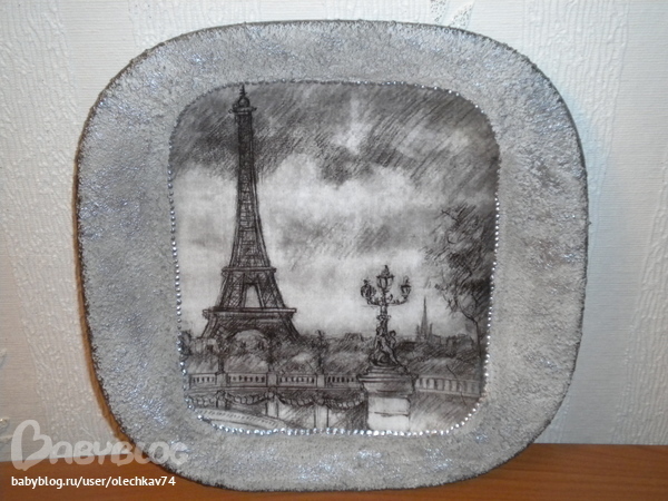 И совет на будущее - картинку лучше клеить по форме как сама тарелка... В данном случае краской чуть сильнее углы скругли... будет лучше...