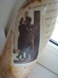 Наклеила с помощью пва открытки на бутылку,подрезала кое в каких местах.Лак.