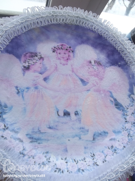 загрунтовала тарелочку белой краской на 2 раза, прошлась нождачкой, нанесла пва. На распечатку нанесла 2 слоя лака, замочила на полчаса, отделила от бумаги. Наклеила распечатку на тарелочку. Хотела без кружева, но т.к. распечатка немного с краю надорвалась сделала по краю кружево.