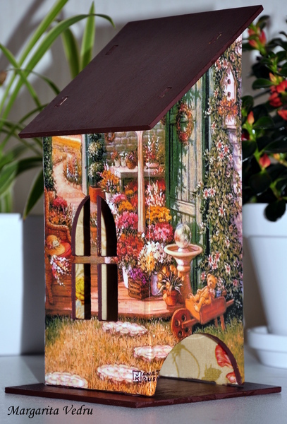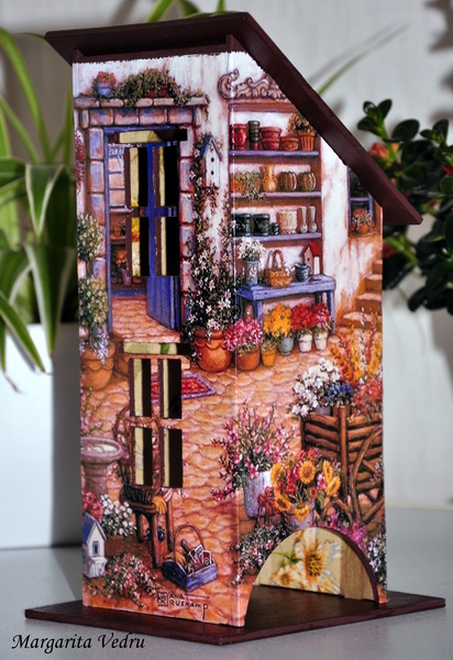 Очень красивый домик! Конечно скорлупа или глина здесь были как раз к месту. Но раз нельзя. то можно наверно кракелюр сделать, причем как 2-х шаговый, так и 1 шаговый. А от рисунков и надписей я бы отказалась. Это мне кажется уже будет перебор, очень пестро.