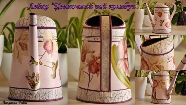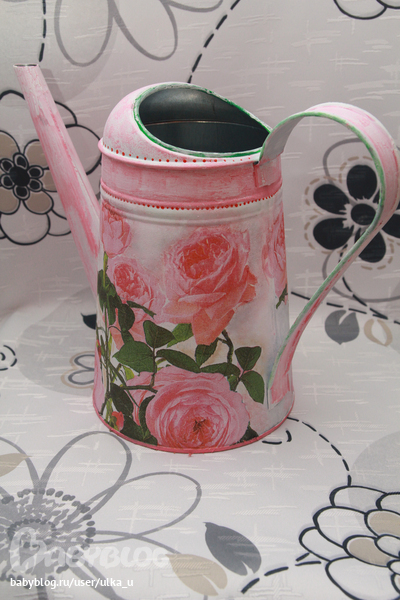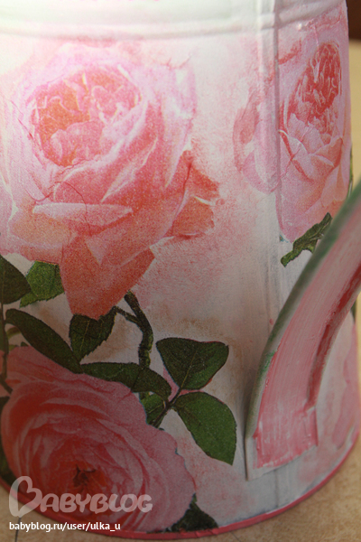 Ход: покрыла лейку акрилом белым 3 слоя, наклеила мотив методом файла, в некоторых местах на салфетке оставила складочки, потом началась моя эпопея с трещинками) У меня был лак Декола, но когда я раньше пробовала им трещины делать у меня не особо получалось, потом тут я прочитала, что этот лак плохой, поехала в магаз и купила maimeri вот такой