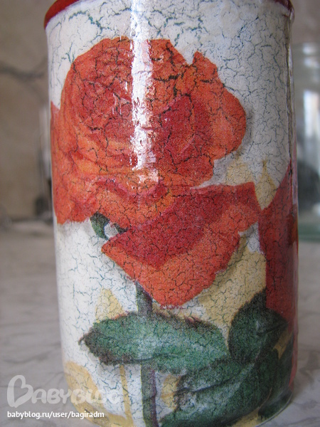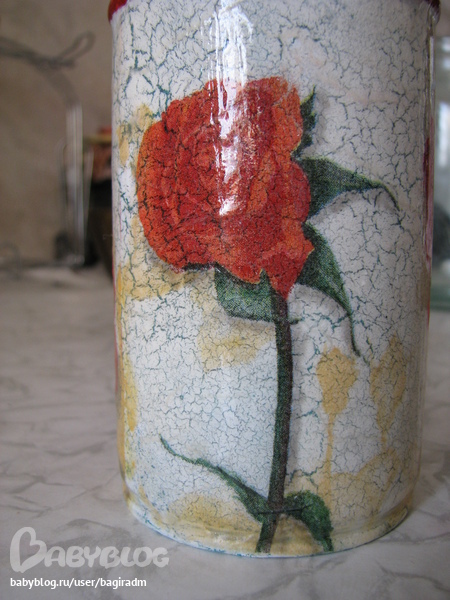 После первой неудачи http://www.babyblog.ru/community/post/decoupageschool/1695962 решила те баночки пока отставить. Родилась вот такая баночка для моих кисточек:
