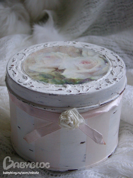 -на крышку с помощью трафарета и грунта акрилового нанесла объемный рисунок.