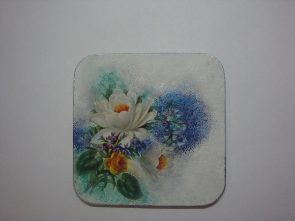 Посоветуйте! (обсуждаем черновые работы)Зачистила шкуркой, покрыла 2 раза акриловой белой краской, нанесла основной фон белый , наклеила мотив, покрыла лаком и нанесла тени,окантовку сделала серебристой краской, планирую пройтись полусухой кистью серебристой краской.